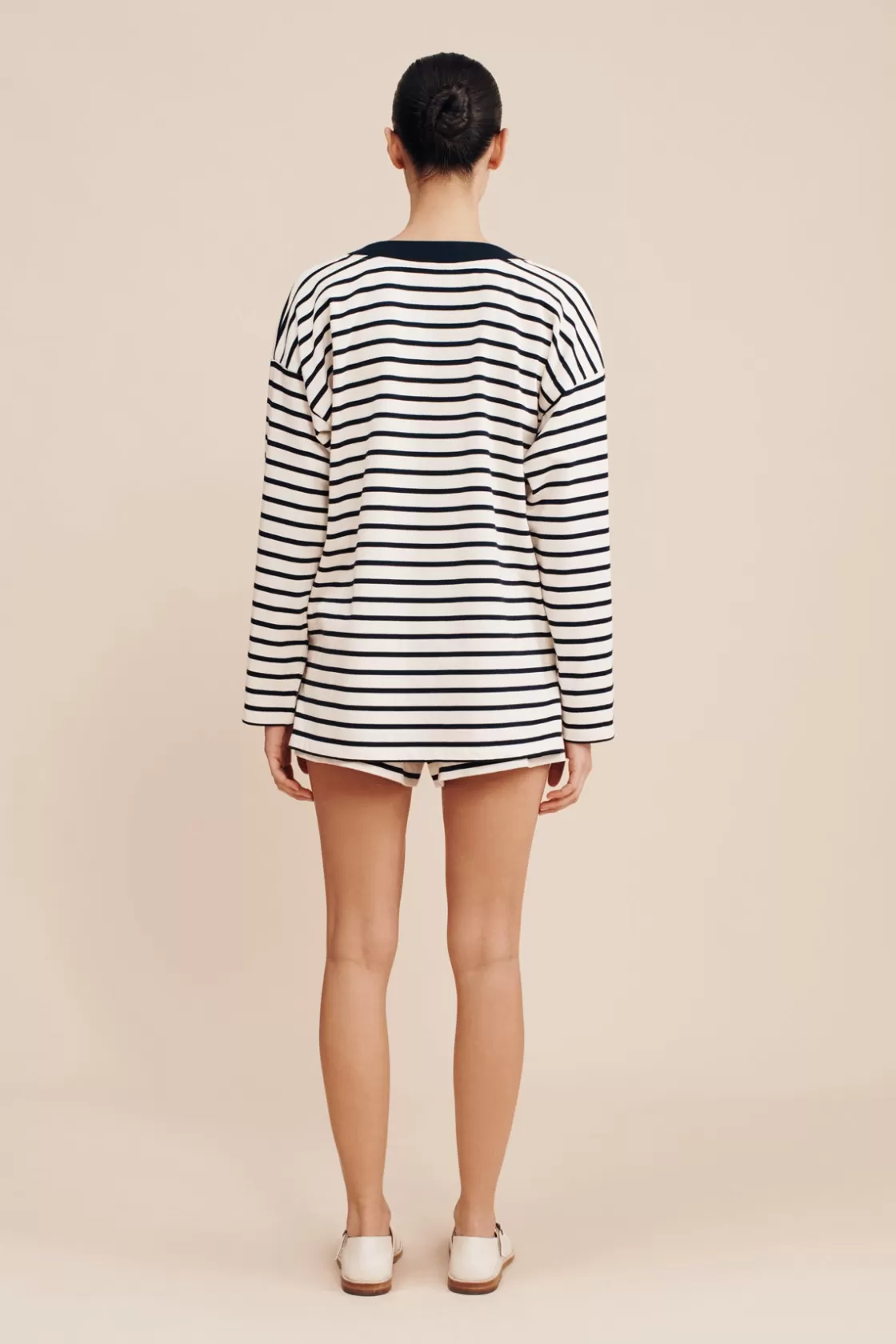 Crafted from lightweight, breathable cotton, The Archie Shorts are patterned with classic navy and cream stripes. Designed to sit high on the waist, they feature a comfortable elasticated waistband and relaxed legs. Style yours as a set with the coordinating Archie Long Sleeve Top.