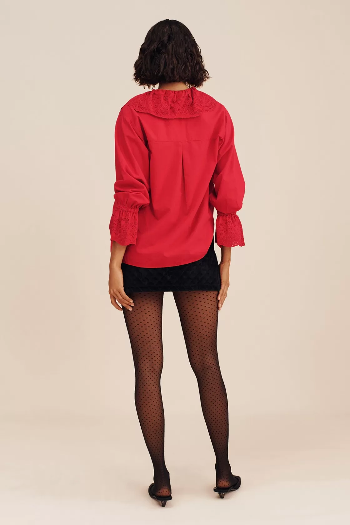 Crafted from crisp cotton in a festive red hue, the Beryl Shirt is designed for a relaxed fit and features a V-neckline and 3/4 billowy sleeves, both framed with ruffles and adorned with intricate embroidery throughout.