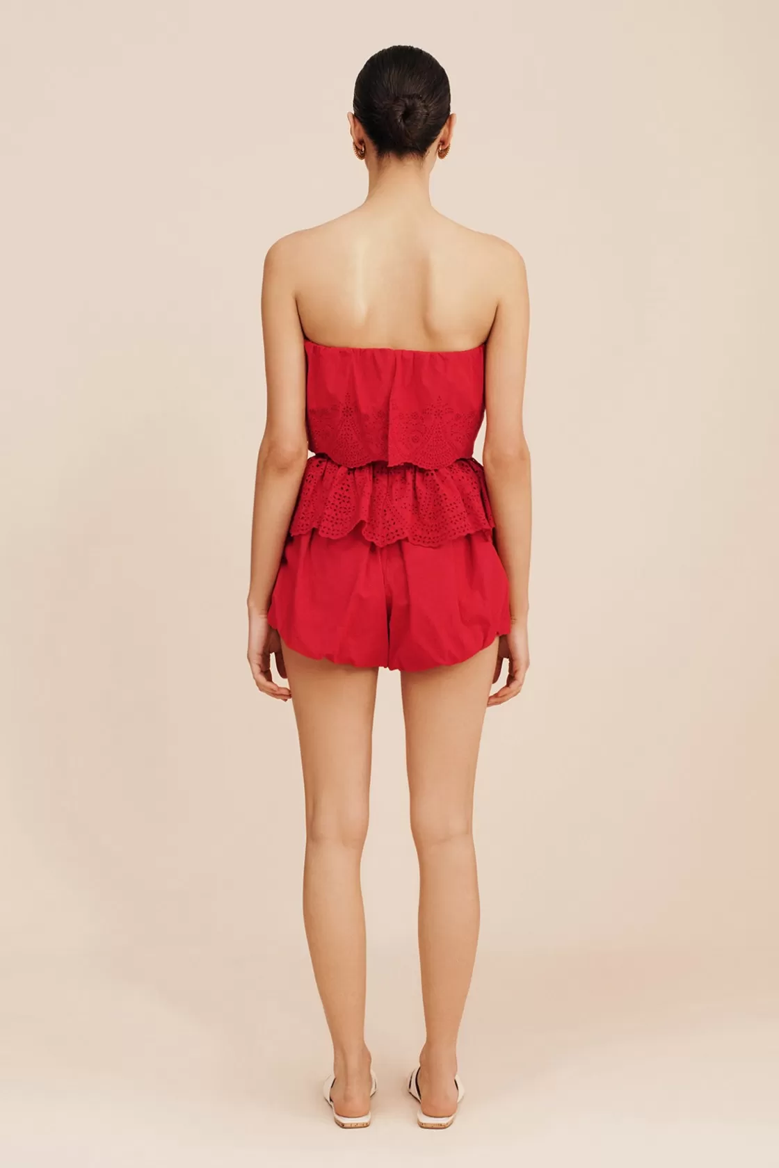 Crafted from crisp cotton in a festive red hue, the Beryl Top has a strapless silhouette framed with ruffles around the waist and peplum hem. It features antique-inspired intricate embroidery throughout. Coordinate yours with the Beryl Skirt or Aurelia Short.