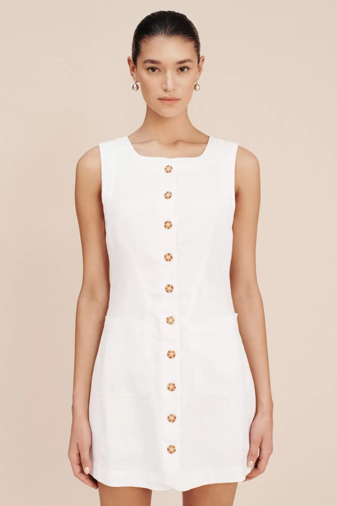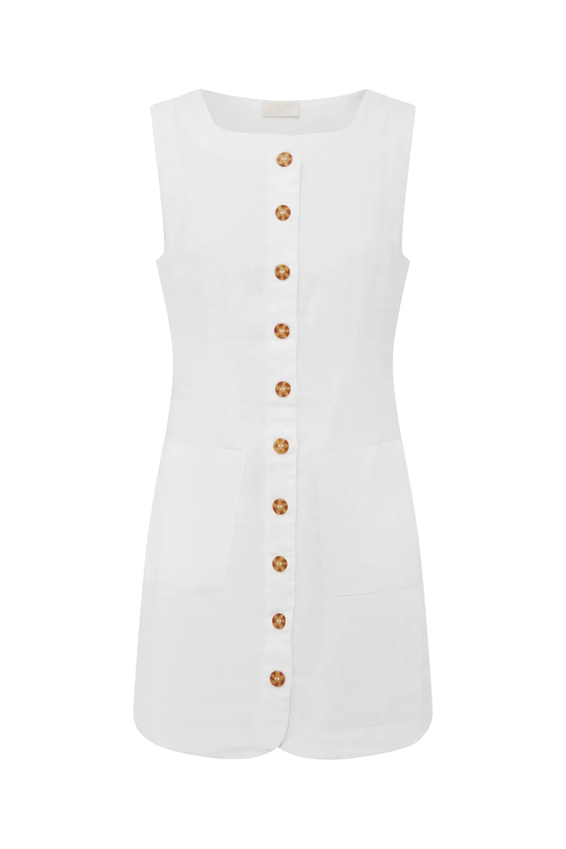An adaptation of our beloved Emma Vest, The Emma Mini Dress is crafted from 100% linen and is perfect for both day and evening wear. It features an elegant high neck, centre front button fastenings and a curved hem. It has an adjustable buckle at the back to cinch in the waist and tailor the fit.