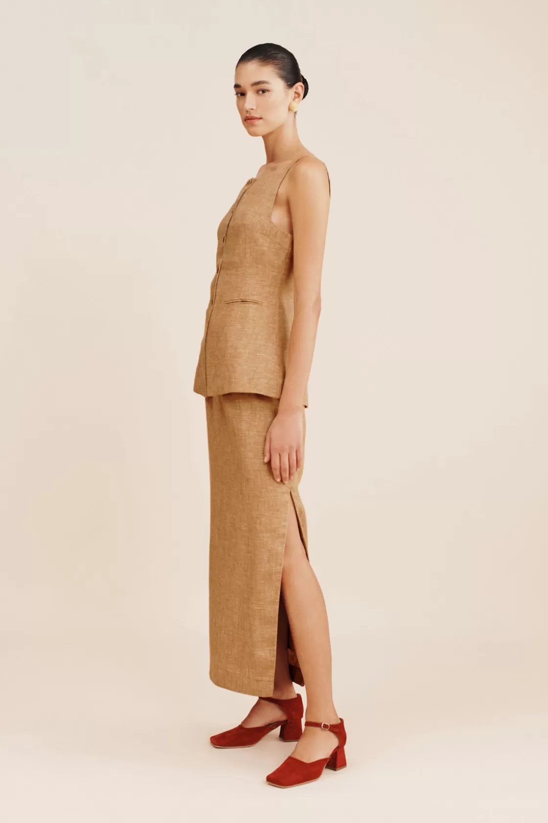 Crafted from 100% linen in an exclusive POSSE handloom, the Nancy Skirt is designed in a classic pencil silhouette. Featuring a high-rise waist, it falls to an elegant maxi hem and has a statement split at the side to allow for movement. Style yours as a set with the coordinating Nancy Gilet.